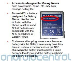 In some “extra” Galaxy Nexus news (you guys ready for Friday!?) I wanted to make sure our readers were well of a few things before they jump the gun and rush to online retailers for accessories, specifically — batteries. As it turns out, NFC and the stock Galaxy Nexus battery go hand-in-hand. You can’t have one, without the other. This is due to the antenna for the NFC chip being integrated into the battery meaning if you go with a 3rd party option, don’t plan on using any of the NFC features like Google Wall- er, Android Beam at least not unless retailers specifically mention something about their product being NFC compatible. Of course, there’s always the option of hitting up Samsung’s site where they will have all the accessories you need for your shiny new Galaxy Nexus — just expect to pay a little premium for their official batteries to keep NFC up and running.